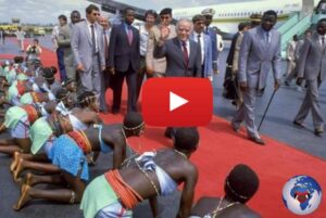 - Deuxième image : Cette image date du régime du Grand Timonier Gnassingbé Eyadéma au Togo, lorsqu’il recevait ses prétendus visiteurs de marque à l’aéroport (l’image est non seulement dénigrante, mais aussi dégradante et délirante). Comment un président peut-il permettre à son peuple de vénérer des présidents Blancs/Européens ?? Agissait-il de la même manière avec ses homologues Noirs/Africains ??