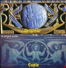 Sur l’image ci-dessous : une copie chrétienne réalisée à plus de deux mille ans d’intervalle, ce pectoral, provenant d’un coffret médiéval en émail champlevé bleu de forme circulaire encadré par deux anges, représente l’image du Christ, considéré dans la religion chrétienne comme la Lumière du monde, une manifestation du Père qui demeure caché. On remarque que les deux représentations mentionnées ci-dessus sont parfaitement superposables; Alors, qui a copié qui ?