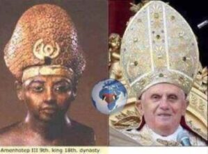 Les mitres des papes et des évêques ne sont que des copies des coiffures/coiffes des pharaons. Enfin, ceux qui accusaient les autres d’être païens ont tout emprunté aux païens, qu’il s’agisse de leurs maîtres, de leurs rituels ou des objets de leurs cérémonies religieuses. Regardez bien ces deux photographies ci-dessus :