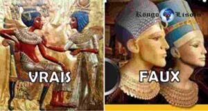 À gauche : Le pharaon Tuanga Imana (Toutankhamon) et sa sœur-épouse, la reine Égyptienne Ankh Sen Imana, tous deux enfants d’Akhenaton et de Néfertiti (le trône de Toutankhamon). Et À droite : Les Égyptiens tels qu’ils ont été dépeints de manière mensongère et idéalisée au cours des 150 dernières années.